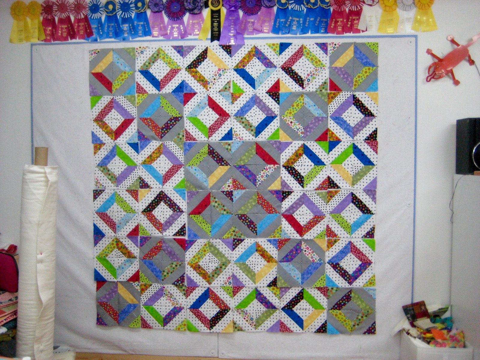 I guess I should show the finished quilt...I did what she wanted and custom quilted it, but even though I used fluorescent threads, the quilting is very hard to see. The quilt fabric is just too busy. Oh well, I like the borders.