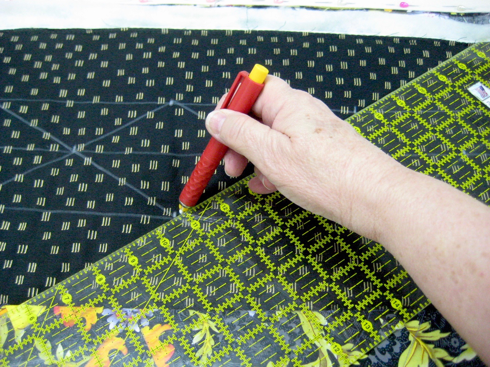 She put a swath of the fabric down the back so people could see where the kaleidoscope blocks on the front came from. |