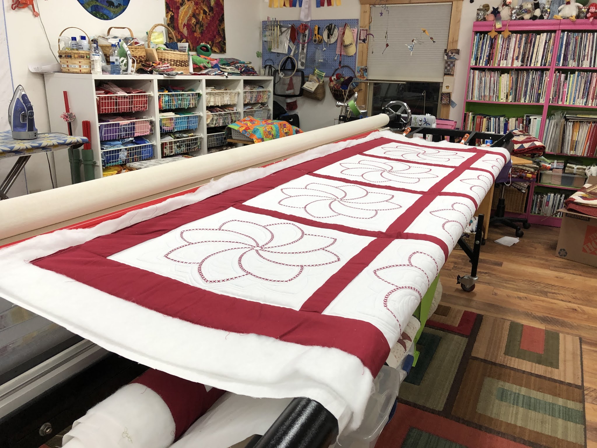 Meanwhile, in the studio yesterday I cleaned up and vacuumed before starting on the day's projects. I took in three more quilts but didn't send any home.
